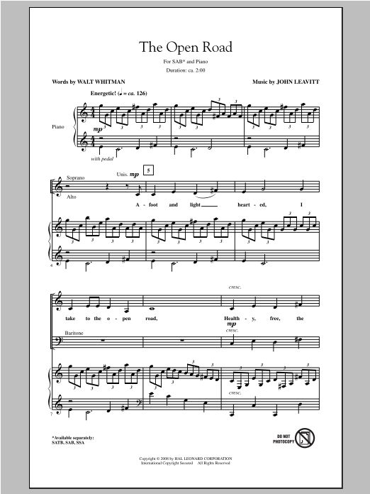 Download or print John Leavitt The Open Road sheet music, chords and digital score arranged for SSA Choir. This Concert score includes 7 page(s).