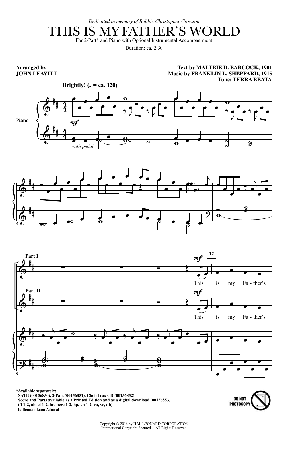 Download or print John Leavitt This Is My Father's World sheet music, chords and digital score arranged for 2-Part Choir. This Sacred score includes 7 page(s).