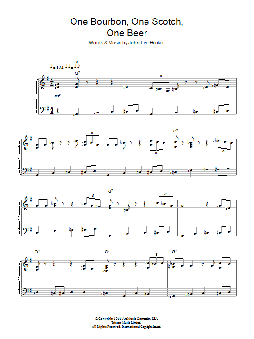 Download or print John Lee Hooker One Bourbon, One Scotch, One Beer sheet music, chords and digital score arranged for Easy Piano. This Blues score includes 2 page(s).