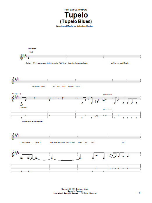 Download or print John Lee Hooker Tupelo (Tupelo Blues) sheet music, chords and digital score arranged for Piano, Vocal & Guitar Chords (Right-Hand Melody). This Blues score includes 2 page(s).