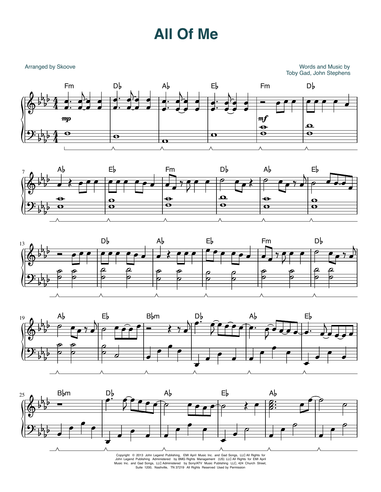 Download or print John Legend All Of Me (arr. Skoove) sheet music, chords and digital score arranged for Piano Solo. This Pop score includes 3 page(s).