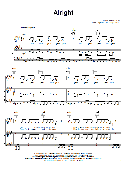 Download or print John Legend Alright sheet music, chords and digital score arranged for Piano, Vocal & Guitar Chords (Right-Hand Melody). This Pop score includes 6 page(s).