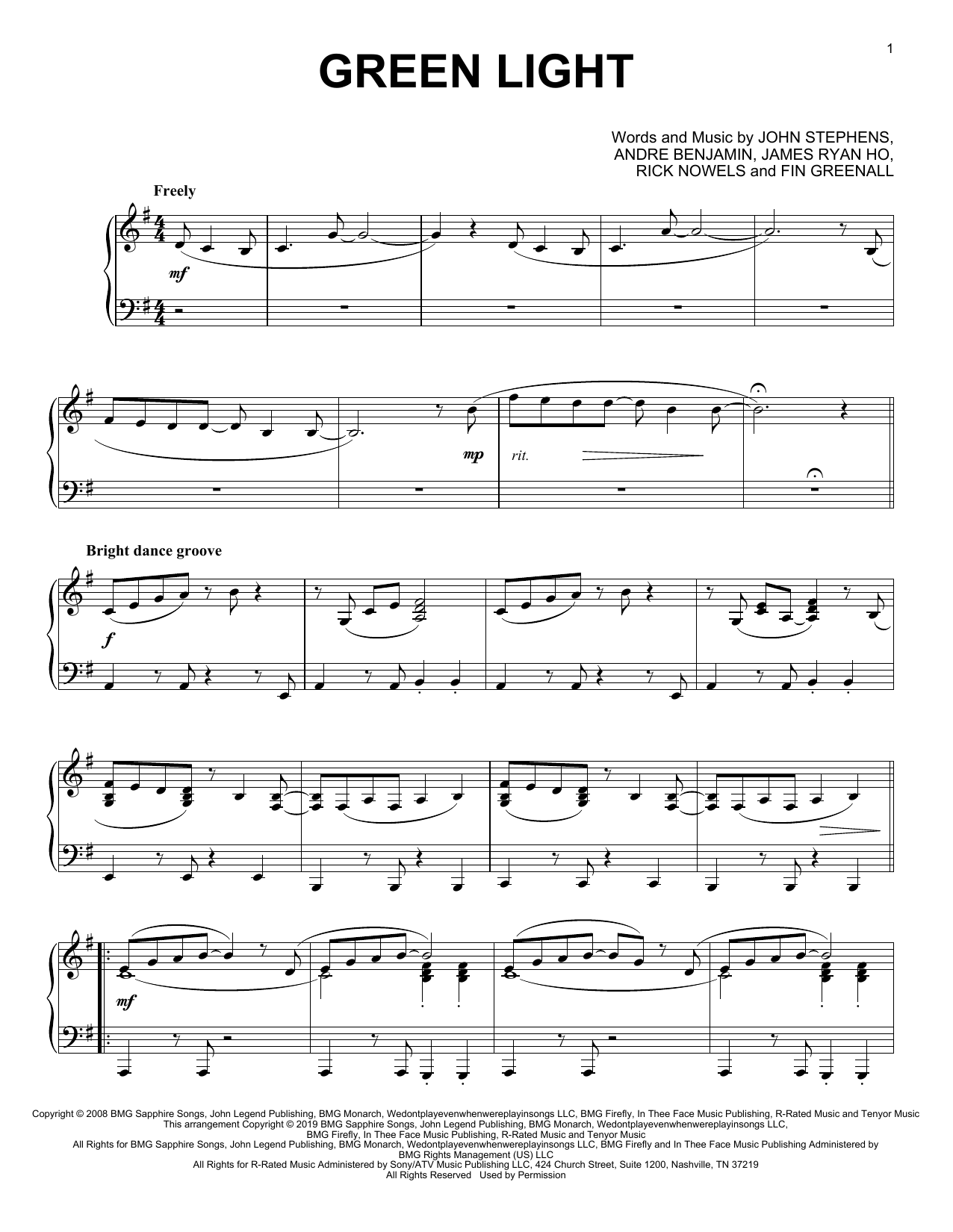 Download or print John Legend Green Light (feat. Andre 3000) sheet music, chords and digital score arranged for Piano Solo. This Pop score includes 4 page(s).
