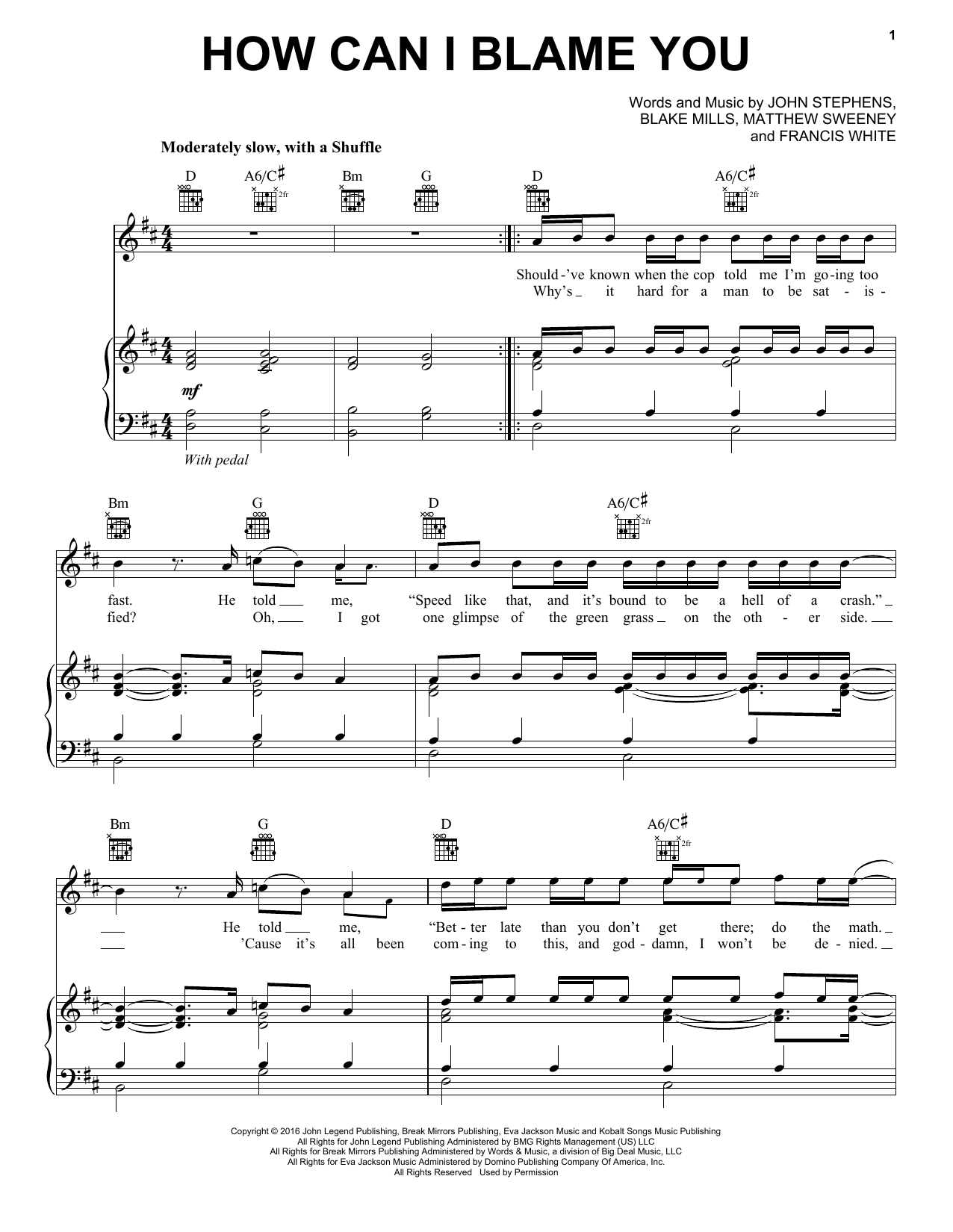 Download or print John Legend How Can I Blame You sheet music, chords and digital score arranged for Piano, Vocal & Guitar Chords (Right-Hand Melody). This Pop score includes 5 page(s).