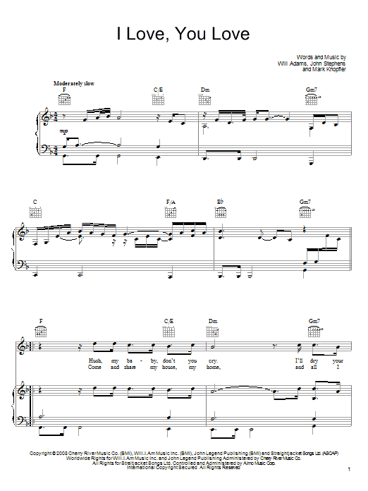 Download or print John Legend I Love, You Love sheet music, chords and digital score arranged for Piano, Vocal & Guitar Chords (Right-Hand Melody). This Pop score includes 5 page(s).