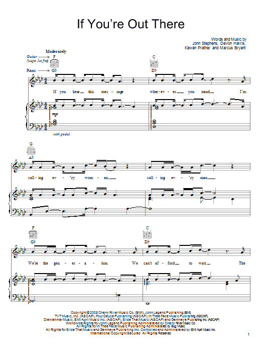 Download or print John Legend If You're Out There sheet music, chords and digital score arranged for Piano, Vocal & Guitar Chords (Right-Hand Melody). This Pop score includes 10 page(s).