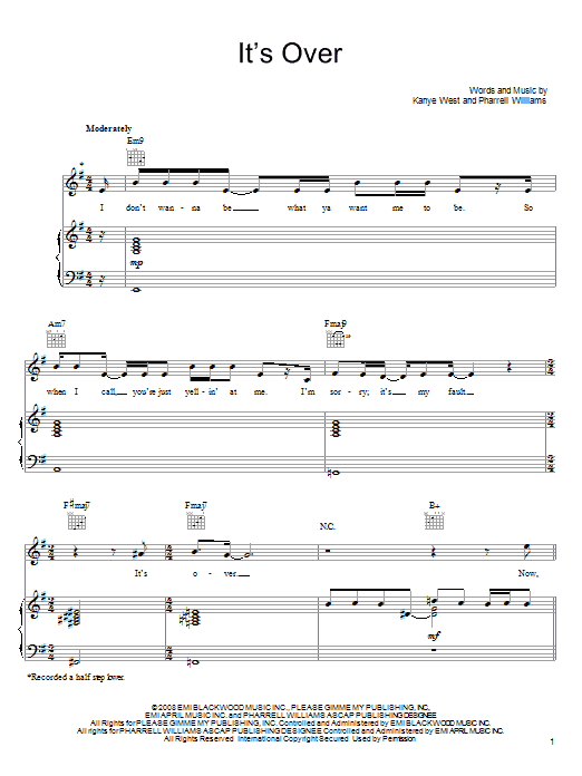 Download or print John Legend It's Over sheet music, chords and digital score arranged for Piano, Vocal & Guitar Chords (Right-Hand Melody). This Pop score includes 10 page(s).