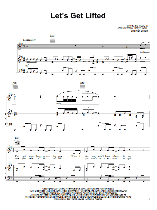 Download or print John Legend Let's Get Lifted sheet music, chords and digital score arranged for Piano, Vocal & Guitar Chords (Right-Hand Melody). This Pop score includes 5 page(s).