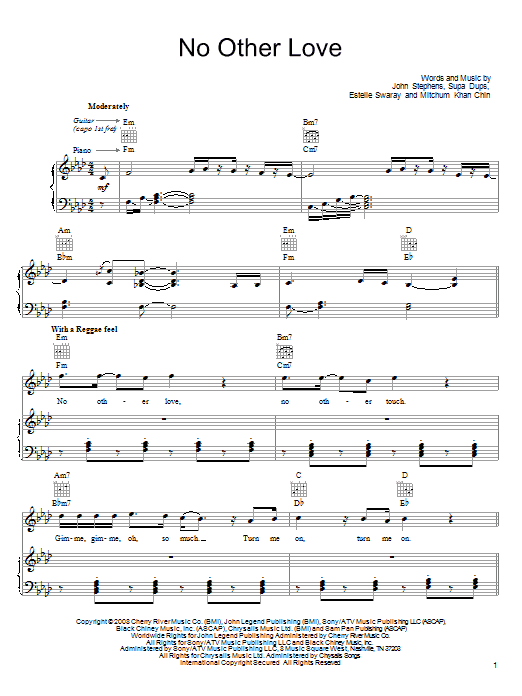 Download or print John Legend No Other Love sheet music, chords and digital score arranged for Piano, Vocal & Guitar Chords (Right-Hand Melody). This Pop score includes 7 page(s).
