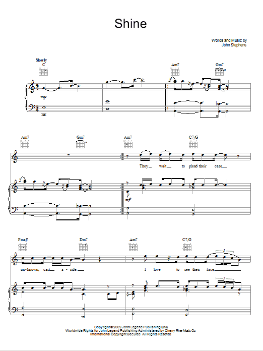 Download or print John Legend Shine sheet music, chords and digital score arranged for Piano, Vocal & Guitar Chords (Right-Hand Melody). This Pop score includes 7 page(s).