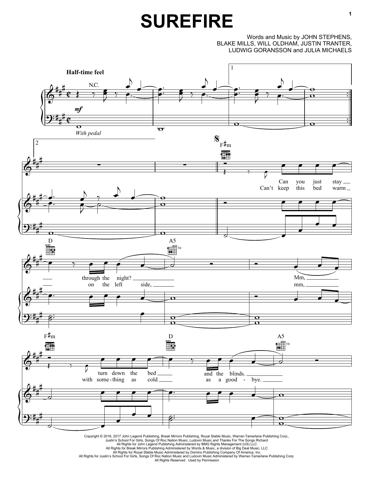 Download or print John Legend Surefire sheet music, chords and digital score arranged for Piano, Vocal & Guitar Chords (Right-Hand Melody). This Pop score includes 7 page(s).