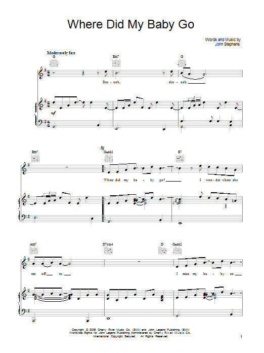 Download or print John Legend Where Did My Baby Go sheet music, chords and digital score arranged for Piano, Vocal & Guitar Chords (Right-Hand Melody). This Pop score includes 7 page(s).