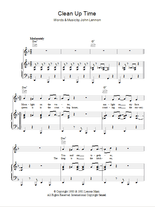Download or print John Lennon Clean Up Time sheet music, chords and digital score arranged for Piano, Vocal & Guitar Chords. This Pop score includes 5 page(s).