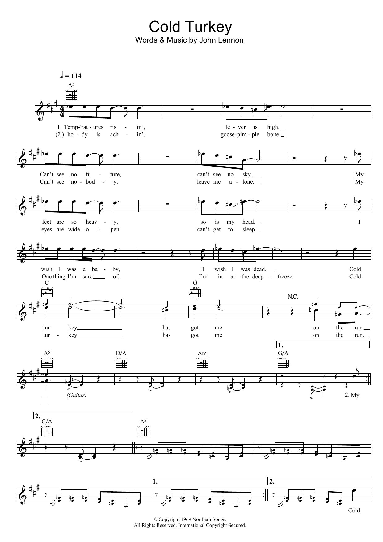 Download or print John Lennon Cold Turkey sheet music, chords and digital score arranged for Piano, Vocal & Guitar Chords. This Pop score includes 5 page(s).