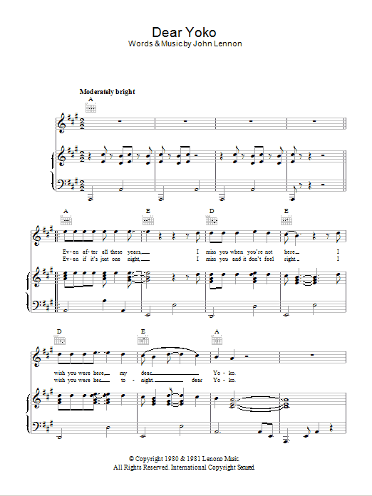 Download or print John Lennon Dear Yoko sheet music, chords and digital score arranged for Piano, Vocal & Guitar Chords. This Pop score includes 5 page(s).