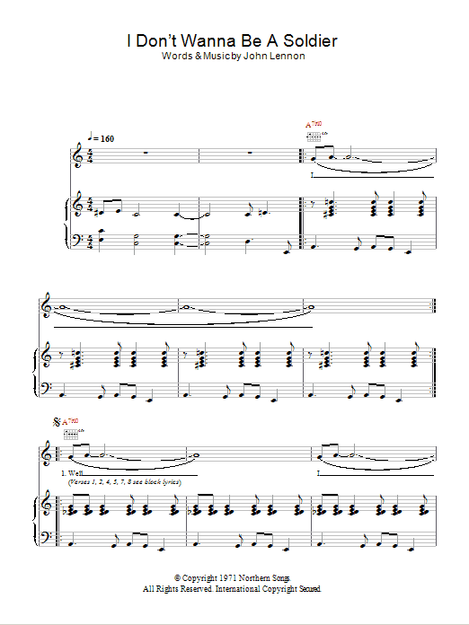 Download or print John Lennon I Don't Wanna Be A Soldier sheet music, chords and digital score arranged for Piano, Vocal & Guitar Chords. This Pop score includes 5 page(s).