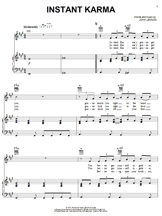 Download or print John Lennon Instant Karma sheet music, chords and digital score arranged for Piano, Vocal & Guitar Chords. This Pop score includes 5 page(s).