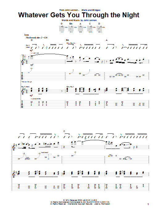 Download or print John Lennon Whatever Gets You Through The Night sheet music, chords and digital score arranged for Guitar Tab. This Pop score includes 8 page(s).