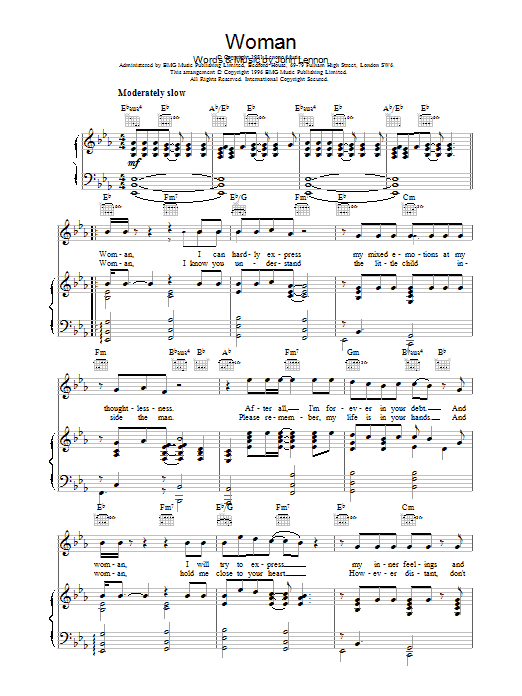 Download or print John Lennon Woman sheet music, chords and digital score arranged for Piano Solo. This Love score includes 3 page(s).