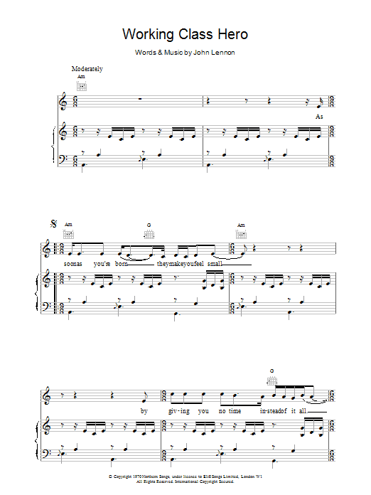 Download or print John Lennon Working Class Hero sheet music, chords and digital score arranged for Piano, Vocal & Guitar Chords (Right-Hand Melody). This Pop score includes 4 page(s).