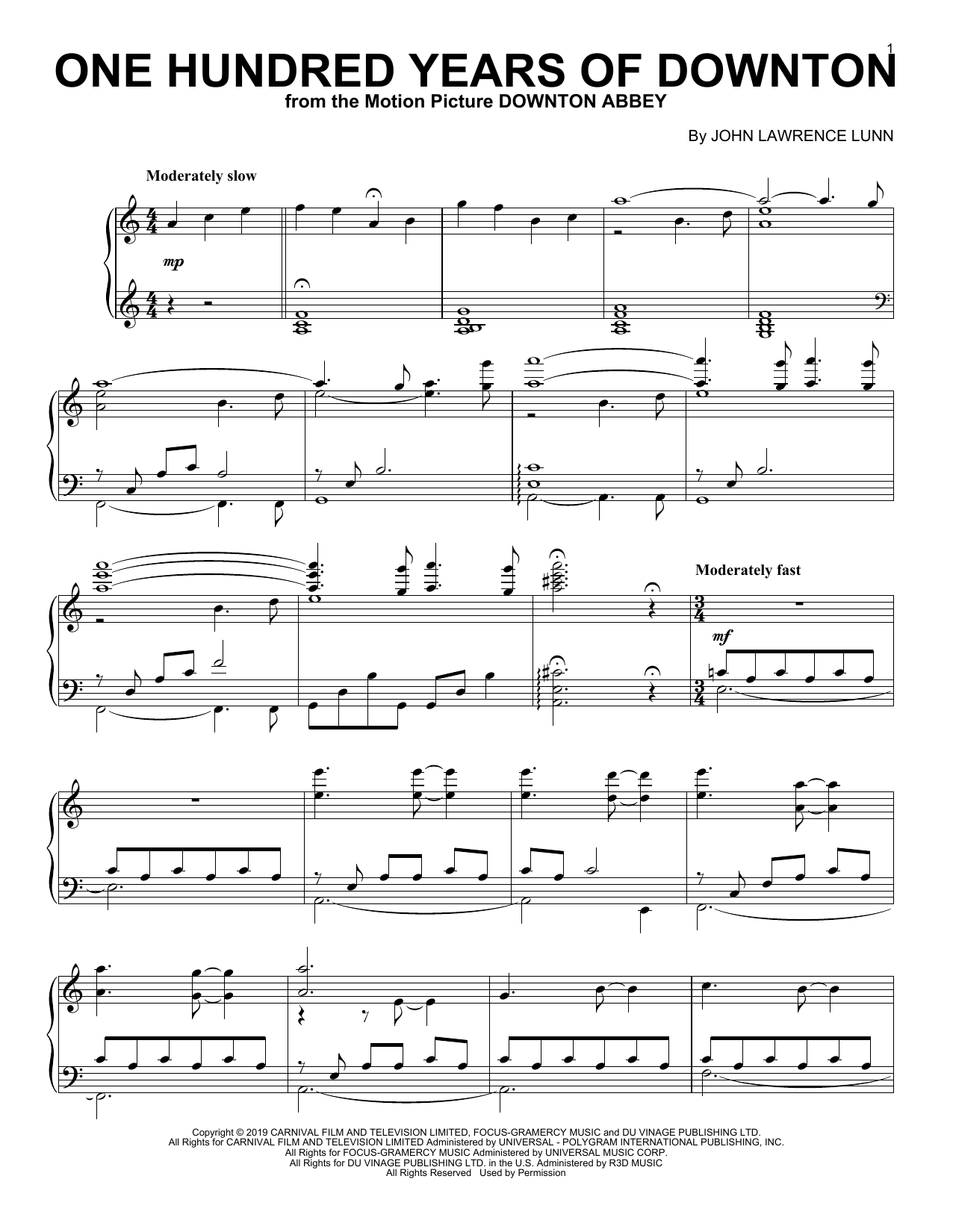 Download or print John Lunn One Hundred Years Of Downton (from the Motion Picture Downton Abbey) sheet music, chords and digital score arranged for Piano Solo. This Film/TV score includes 7 page(s).