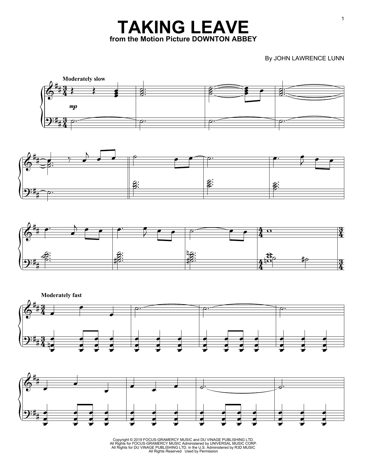 Download or print John Lunn Taking Leave (from the Motion Picture Downton Abbey) sheet music, chords and digital score arranged for Piano Solo. This Film/TV score includes 4 page(s).