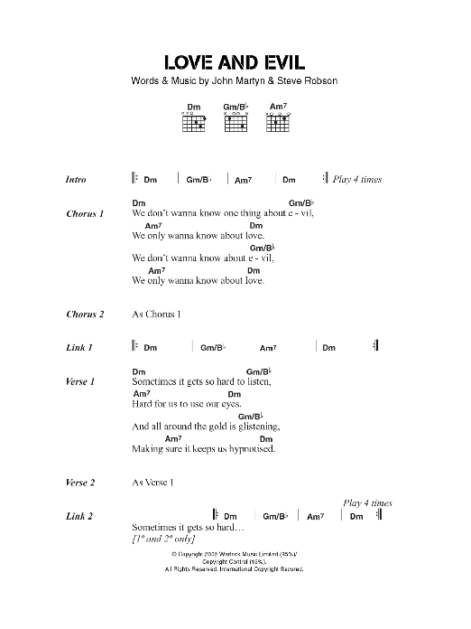 Download or print John Martyn Love And Evil sheet music, chords and digital score arranged for Guitar Chords/Lyrics. This Pop score includes 2 page(s).