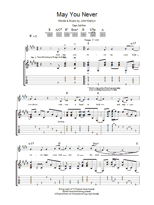 Download or print John Martyn May You Never sheet music, chords and digital score arranged for Lead Sheet / Fake Book. This Pop score includes 2 page(s).