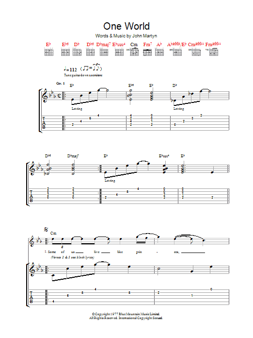 Download or print John Martyn One World sheet music, chords and digital score arranged for Guitar Tab. This Folk score includes 9 page(s).