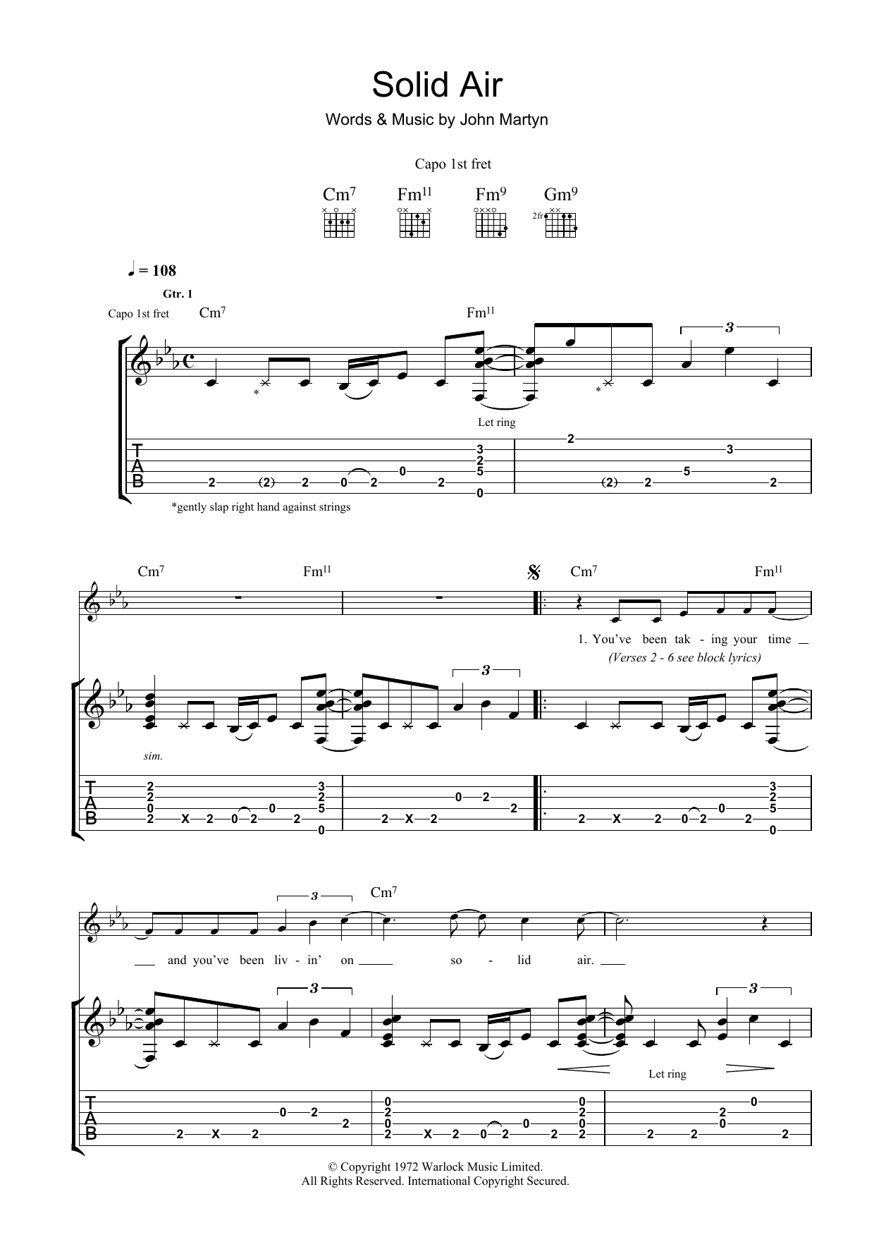 Download or print John Martyn Solid Air sheet music, chords and digital score arranged for Guitar Tab. This Rock score includes 7 page(s).