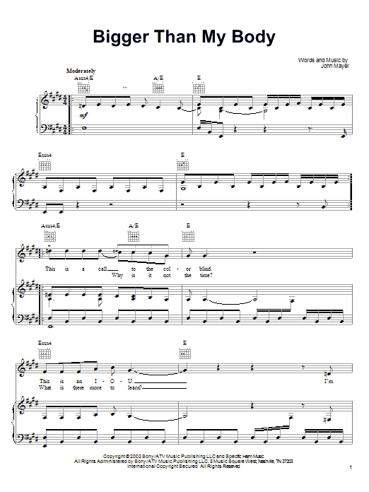 Download or print John Mayer Bigger Than My Body sheet music, chords and digital score arranged for Guitar Chords/Lyrics. This Rock score includes 4 page(s).