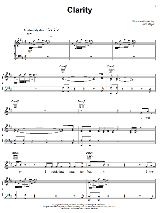 Download or print John Mayer Clarity sheet music, chords and digital score arranged for Guitar Tab. This Pop score includes 7 page(s).