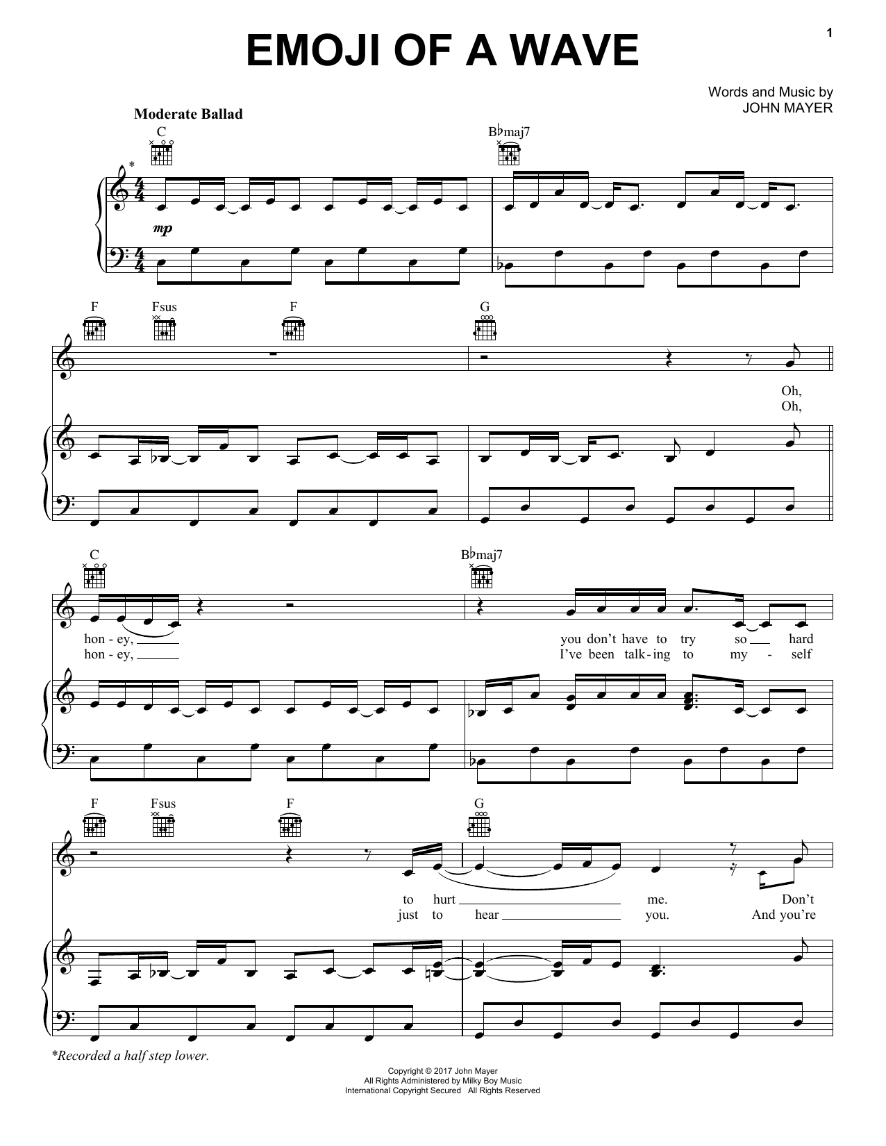 Download or print John Mayer Emoji Of A Wave sheet music, chords and digital score arranged for Piano, Vocal & Guitar Chords (Right-Hand Melody). This Pop score includes 6 page(s).