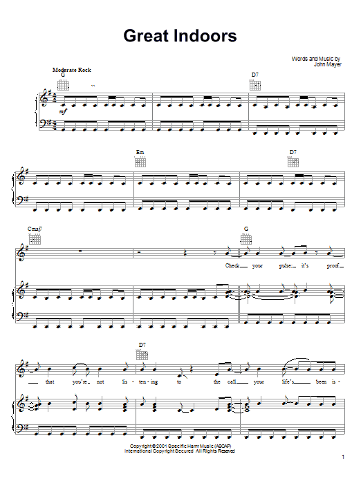 Download or print John Mayer Great Indoors sheet music, chords and digital score arranged for Piano, Vocal & Guitar Chords (Right-Hand Melody). This Pop score includes 7 page(s).