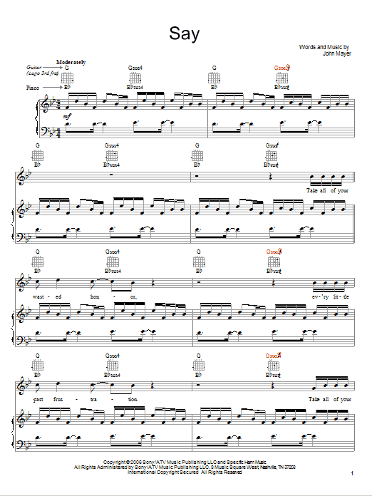 Download or print John Mayer Say sheet music, chords and digital score arranged for Piano, Vocal & Guitar Chords (Right-Hand Melody). This Pop score includes 8 page(s).
