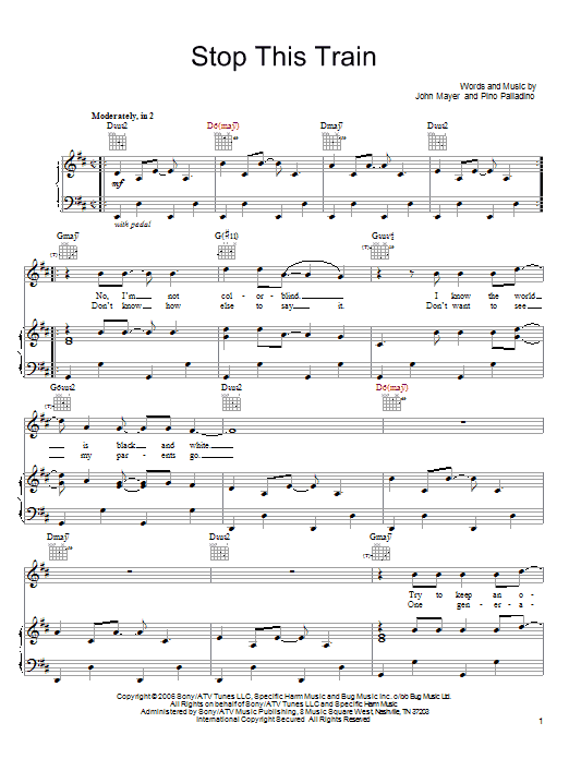 Download or print John Mayer Stop This Train sheet music, chords and digital score arranged for Guitar Lead Sheet. This Rock score includes 3 page(s).