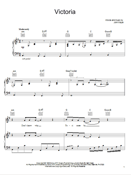 Download or print John Mayer Victoria sheet music, chords and digital score arranged for Piano, Vocal & Guitar Chords (Right-Hand Melody). This Pop score includes 7 page(s).
