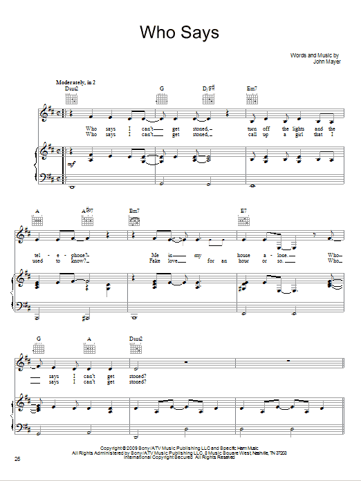 Download or print John Mayer Who Says sheet music, chords and digital score arranged for Easy Piano. This Rock score includes 5 page(s).