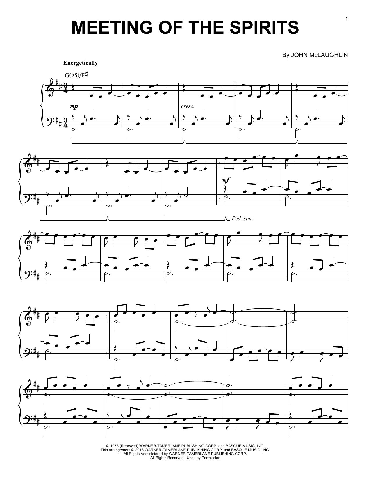 Download or print John McLaughlin Meeting Of The Spirits sheet music, chords and digital score arranged for Piano Solo. This Jazz score includes 5 page(s).