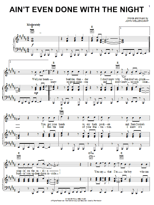 Download or print John Mellencamp Ain't Even Done With The Night sheet music, chords and digital score arranged for Piano, Vocal & Guitar Chords (Right-Hand Melody). This Pop score includes 3 page(s).