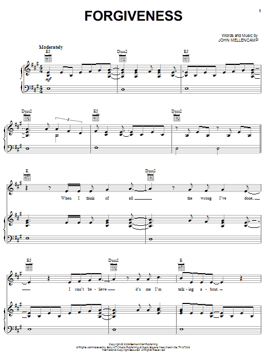 Download or print John Mellencamp Forgiveness sheet music, chords and digital score arranged for Piano, Vocal & Guitar Chords (Right-Hand Melody). This Pop score includes 7 page(s).