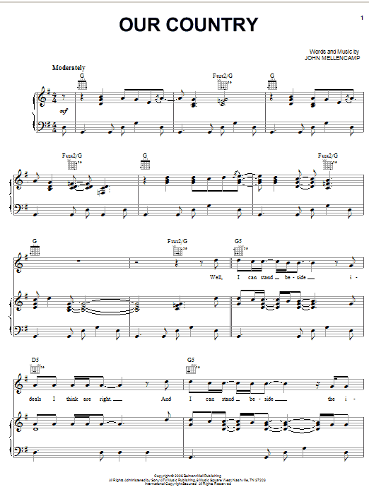 Download or print John Mellencamp Our Country sheet music, chords and digital score arranged for Piano, Vocal & Guitar Chords (Right-Hand Melody). This Pop score includes 6 page(s).