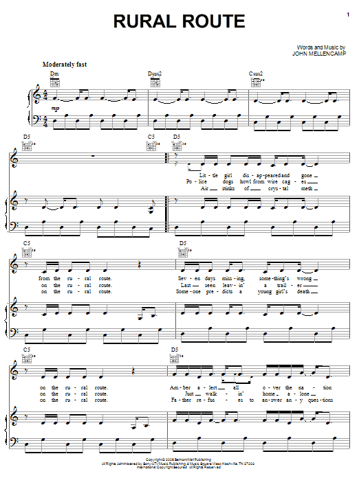 Download or print John Mellencamp Rural Route sheet music, chords and digital score arranged for Piano, Vocal & Guitar Chords (Right-Hand Melody). This Pop score includes 5 page(s).