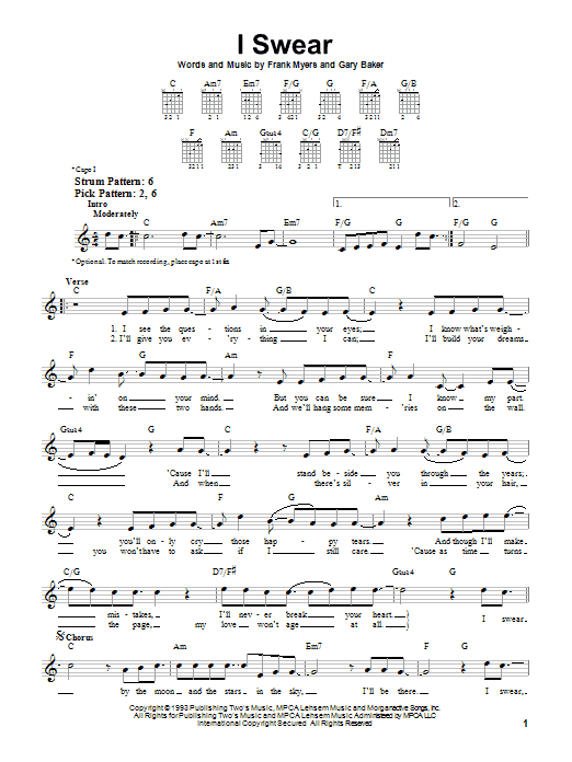 Download or print John Michael Montgomery I Swear sheet music, chords and digital score arranged for Super Easy Piano. This Country score includes 2 page(s).