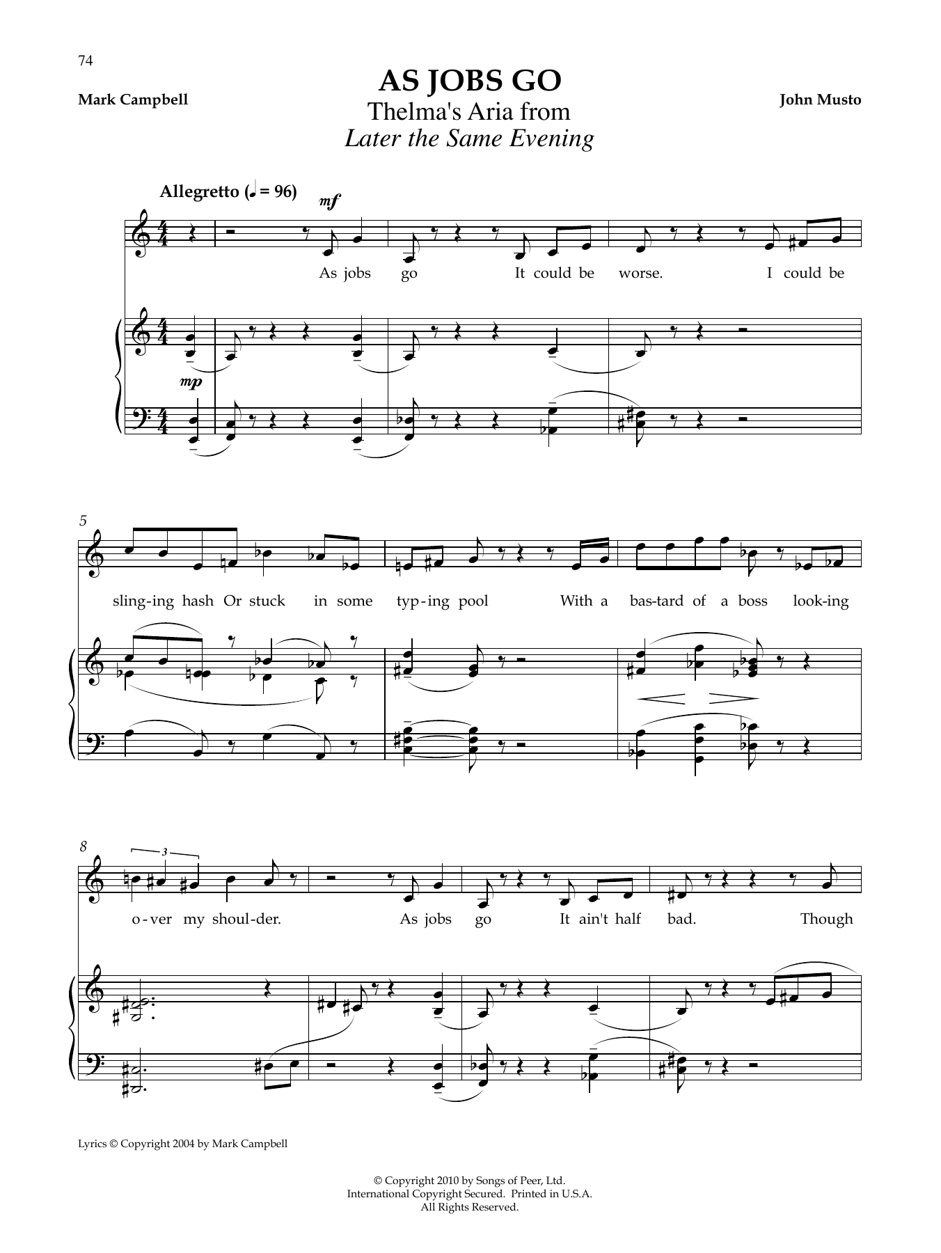 Download or print John Musto As Jobs Go sheet music, chords and digital score arranged for Piano & Vocal. This Classical score includes 9 page(s).