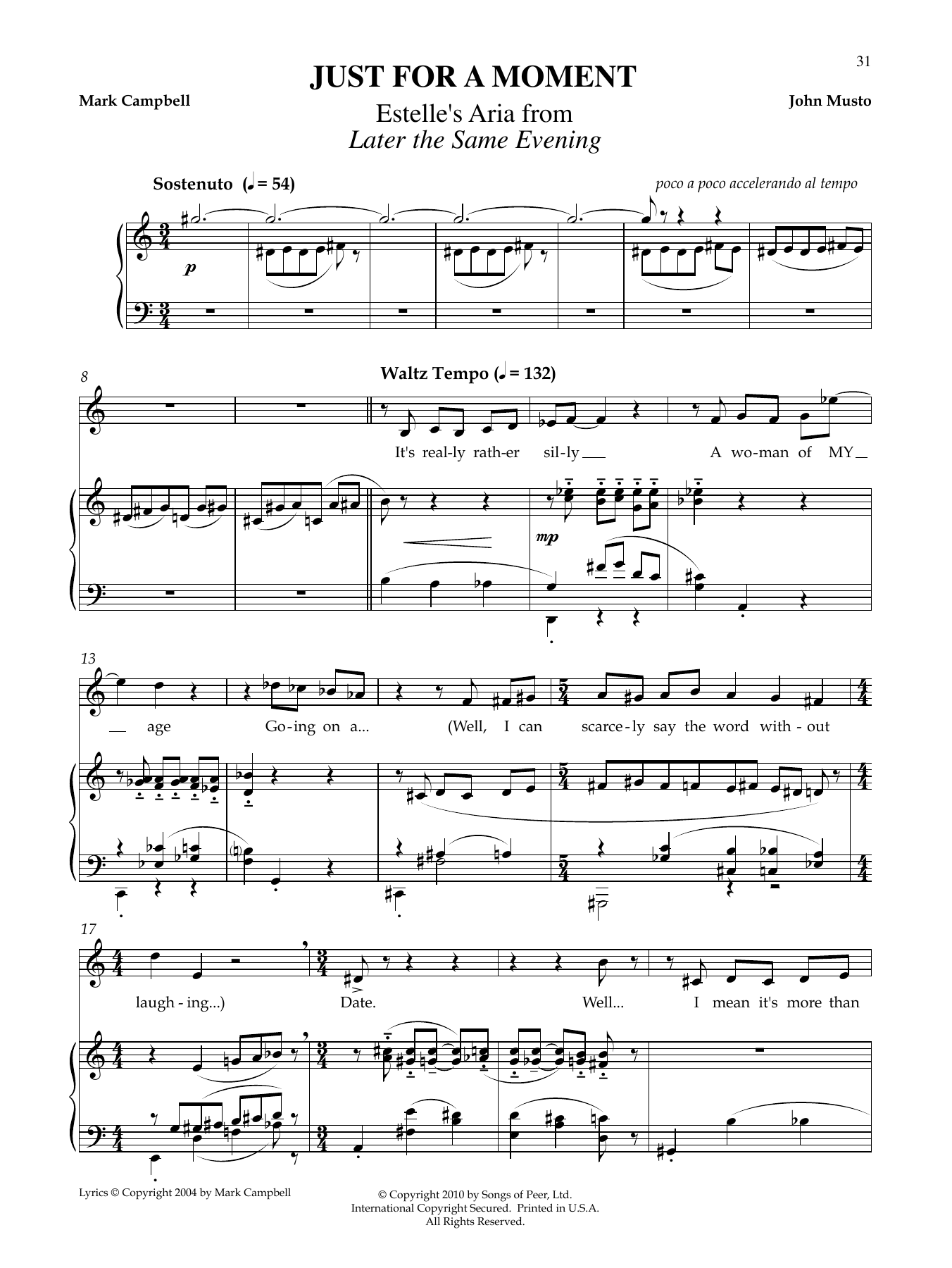 Download or print John Musto Just For A Moment sheet music, chords and digital score arranged for Piano & Vocal. This Classical score includes 16 page(s).