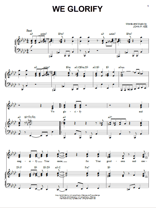 Download or print John P. Kee We Glorify sheet music, chords and digital score arranged for Piano, Vocal & Guitar Chords (Right-Hand Melody). This Christian score includes 8 page(s).