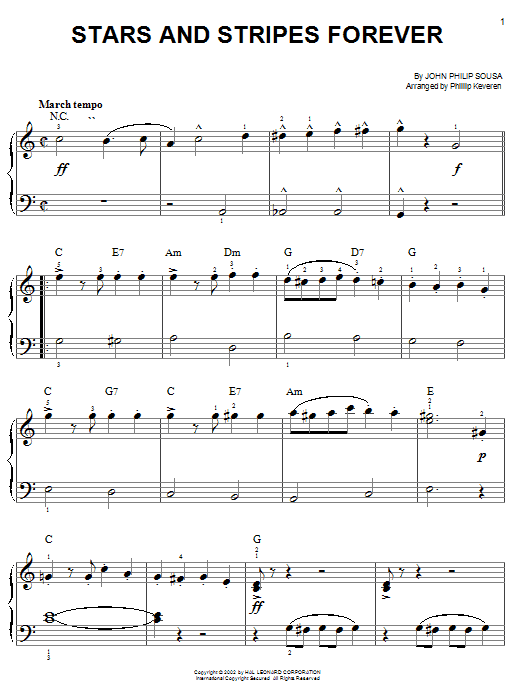 Download or print John Philip Sousa Stars And Stripes Forever sheet music, chords and digital score arranged for Piano Solo. This Classical score includes 5 page(s).