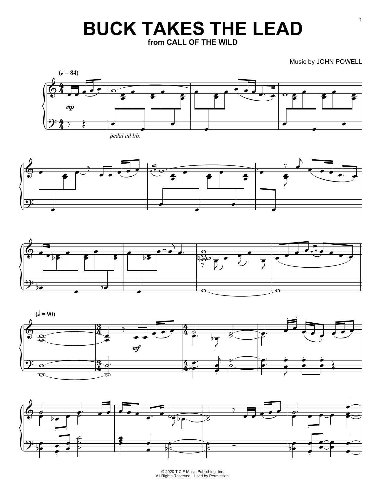 Download or print John Powell Buck Takes The Lead (from The Call Of The Wild) (arr. Batu Sener) sheet music, chords and digital score arranged for Piano Solo. This Film/TV score includes 3 page(s).