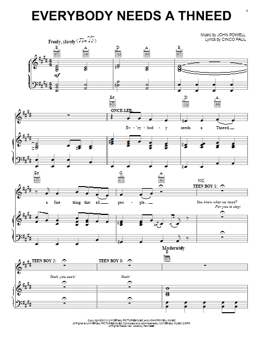 Download or print John Powell Everybody Needs A Thneed sheet music, chords and digital score arranged for Piano, Vocal & Guitar Chords (Right-Hand Melody). This Children score includes 4 page(s).